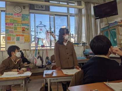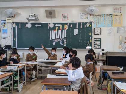3学期のお楽しみ会でするみんな遊びは何がいいかを話し合いで決めました。意見がある子を司会が指名し、自分の考えを述べます。「〇〇さんの意見に賛成です」「〇〇さんの意見に付け足しです」と、話し合いの言葉を正しく使って発表できるようになりました。