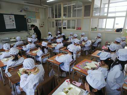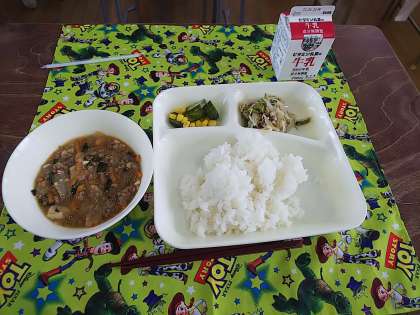 給食が始まりました。初日は麻婆豆腐中心の中華献立でした。みんな、久しぶりの給食に大喜び。