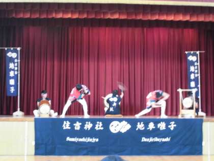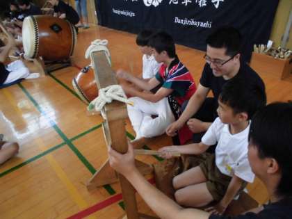 1時間目に「だんじりばやし」の体験をしました。大太鼓・小太鼓・かねの3種類で、いろいろなリズムを奏でていました。実際に体験してみると、かなり難しかったです。