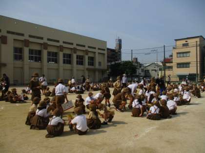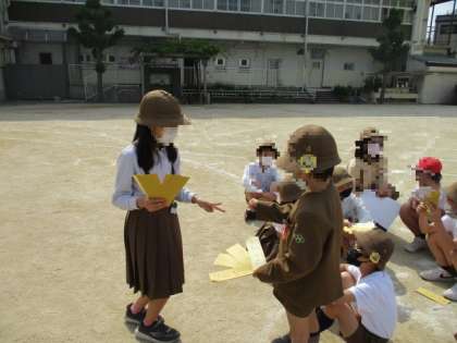 たてわり班の顔合わせが終わり、はじめての児童集会でした。集会委員会の司会で、「3枚のお札」ゲームをしました。ひとり3枚の持ち札に自分の名前を書いています。班のメンバーとじゃんけんをして勝った人が負けた人のお札をもらいます。お札を渡すときには自分の名前も言います。
