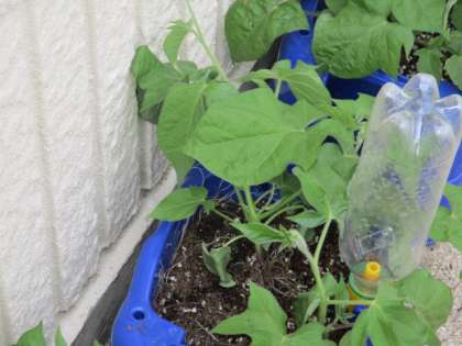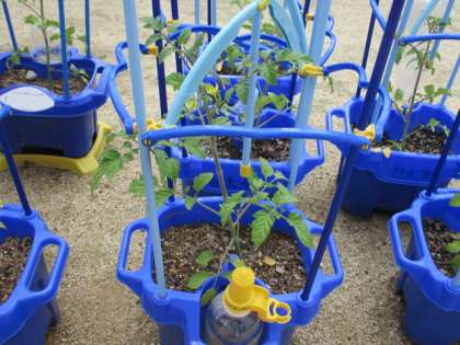 写真は1年生が種から育てているあさがお、2年生のミニトマト、4年生のひょうたんのようすです。どれも日に日に大きく育っています。水やりなどのお世話もがんばっています。