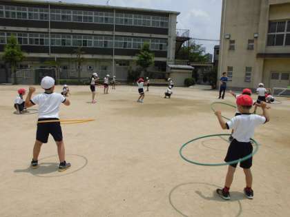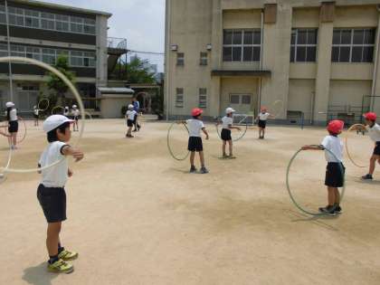 フラフープでは、右手で回す・左手で回す・両手で回す・腰で回す・回転をかけることをしています。腰で3分間回せる児童は5人もいます。みんなその友だちに負けないように毎回必死に頑張っています。