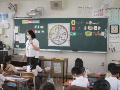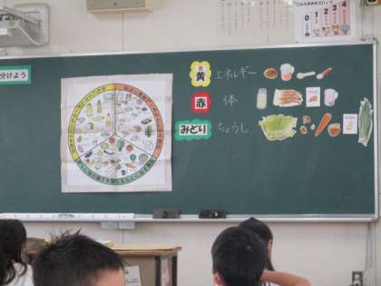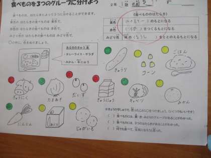 今日は高見小学校の栄養教諭の先生が来て、食に関する授業をしてくださいました。テーマは「食べ物を3つのグループにわけよう」です。
