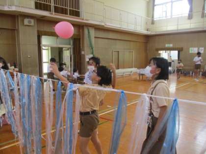 7班は「たからさがし」です。1000個近い数の紙コップの中に宝が隠してあります。制限時間内にどれだけ宝を探せるのか点数を競います。8班は「ふわふわバルーンバレー」ちょっと高めのネットの高学年対抗戦と低めのネットの低学年対抗戦をしました。