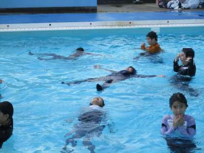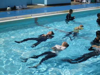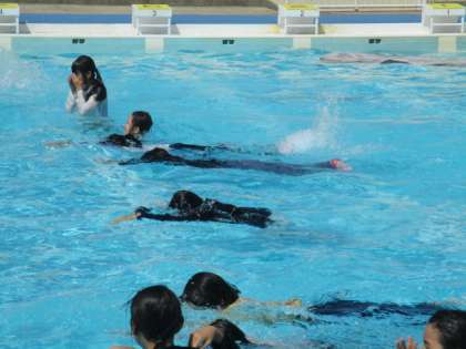 服を着たまま水に入ると思わず声がでそうになります。長袖の服に、ジーンズのような厚手のズボンの児童も多く、水の重さに驚いていました。着衣のまま、いつものように泳ごうとすると、うまく泳げません。また、何も持たずに自力でただ浮くことにも挑戦しましたが、1分半も浮くことができませんでした。これで、海や川では波や流れがあると思うとやはり怖いなあとあらためて思わされます。