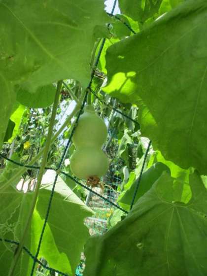 学習園のひょうたんが少し大きくなってきました。花もたくさん咲いていました。たくさん実がなったらいいですね。