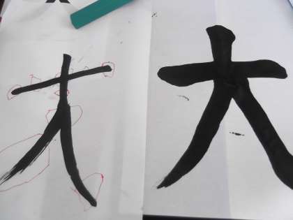 「大」という字を見比べてください。右は指導前、左は指導後。45分の授業で驚くほど上達しました。18日の学校開放デーでも書写をしますので、ぜひ参観してください。