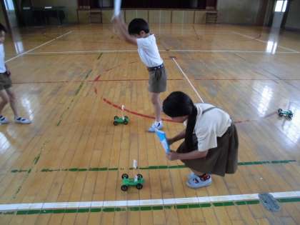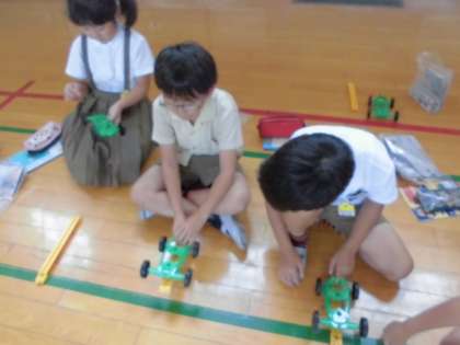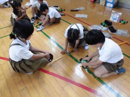 3年生になって初めての理科の実験です。ゴムの数と伸ばす長さを変えて、進む距離をはかりました。楽しさの中から、いろいろなことを気づいてほしいです。