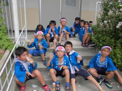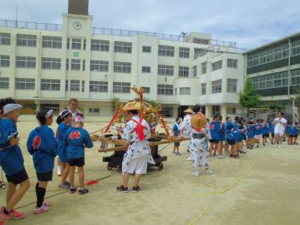 蒸し暑い中、熱中症を心配しながらも、子どもたちは、「わっしょい!わっしょい」と元気のよい声をあげ、休憩場の1つである四貫島小学校に入ってきました。