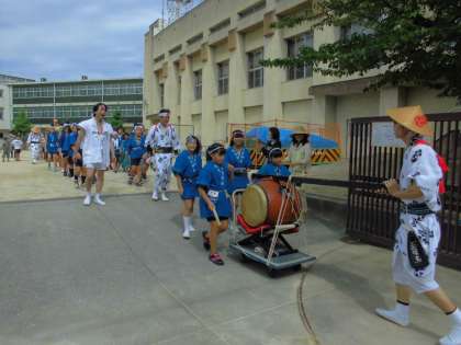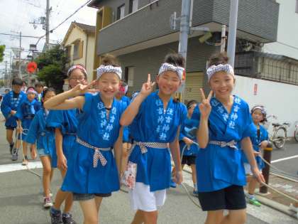 子どもたちは、おそろいのはっぴと豆しぼりを身につけ、暑い中、頑張りました。