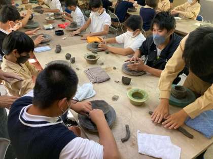 ろくろの上に粘土をのせて、陶芸に熱心に取り組んでいます。だんだん皿や茶碗の形ができあがってきました。