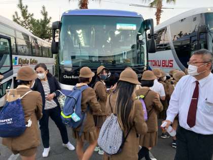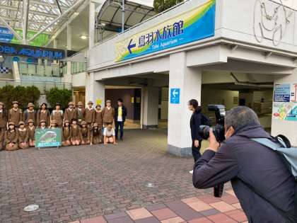 水族館での活動の最後に、入口の前で記念撮影をしました。それぞれおみやげの袋を手にバスに乗り込み、鳥羽水族館を後にしました。