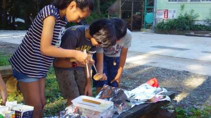 朝会を高原で行い、アサヒロッジへ戻って来たら、さっそく朝食作りです。