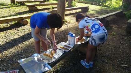 5年 林間学習 その12「朝食 カートンドッグ作り」7月25日