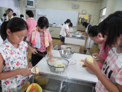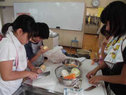 PTAの方々と高学年の児童が中心になり、カレーを作りました。たくさんの人数分を作らなくてはいけないので大変です。暑い家庭科室で、汗を流しながら、美味しいカレーになるよう、頑張っています。