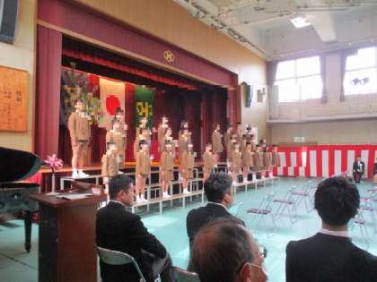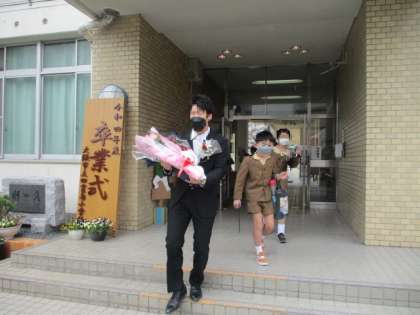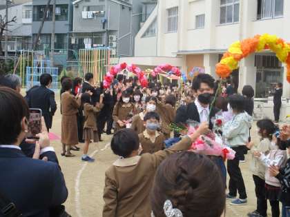 保護者の方や5年生、先生方の花道を通って、晴れやかな絵顔をした卒業生たちでした。