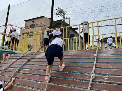 遊具の使い方を学習し、みんなで遊具遊びをしました。縄を引っ張って登ったり、すべり台から滑り降りたり、体をたくさん動かしました。遊具遊びの後は、みんなでおにごっこをしました。みんなで仲良く遊ぶことができました。