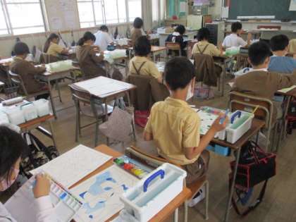 図工は、一筆書きデザインで濃淡をつけて、絵の具で色塗りをしていました。