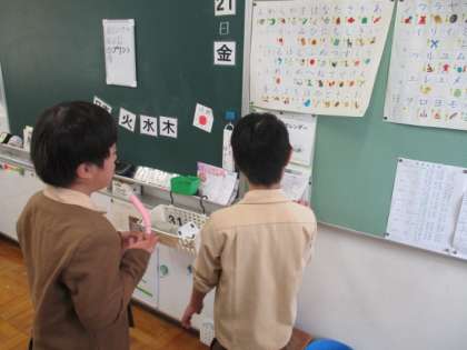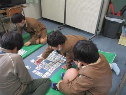 カルタとりをして言葉の学習をしています。集中して問題に取り組んでいます。今日の日付や給食カレンダーを読んで、一日の過ごし方を確認しています。毎日頑張っています。