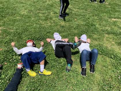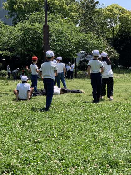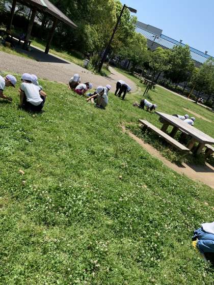 植物がたくさんあったので、シロツメクサで指輪やかんむりを作ったり、全員で四つ葉のクローバー探しを行ったりと、自然と多く触れ合うことができました。とてもいいお天気で、ひなたぼっこをする子も多かったです。