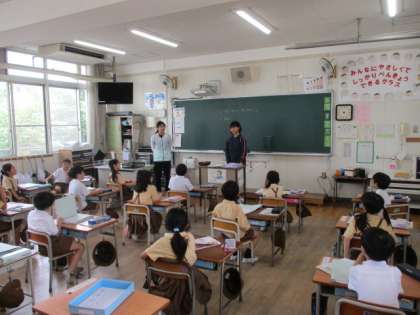 本日より2日間、中学校の生徒が職場体験に来ています。本校の卒業生で、久しぶりの小学校の様子に懐かしさも感じながら、少し緊張していました。子どもたちから「〇〇先生!」と名前を呼ばれながら、笑顔で子どもたちと過ごしていました。