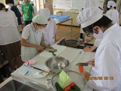 本日、6年生になって初めての調理実習です。3色野菜炒めを作りました。野菜の種類によって切り方が違うので、班で確認しながら協力して切りました。上手に炒められるかな?