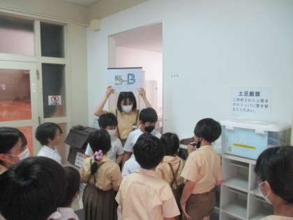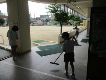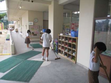 上級生が下級生に掃除の仕方を教えたり、集合場所を伝えたりしています。
