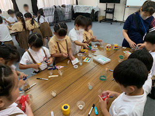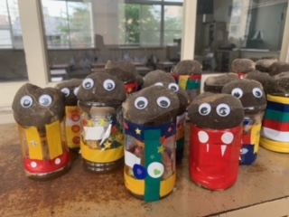 ? 出前講座で、生涯学習ルームの方々に芝人形作りを教えていただきました。ストッキングに砂と芝の種を入れ、ペットボトルに飾り付けをして、オリジナルの服も作りました。