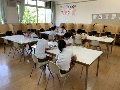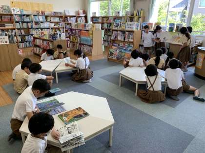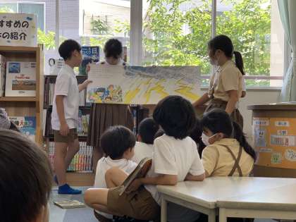 毎週木曜日は図書室に行って本を読んでいます。先週までは先生に読み聞かせを行ってもらっていましたが、今週は子どもたちで読み聞かせを行っていました。