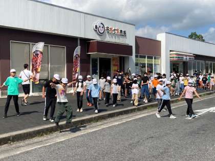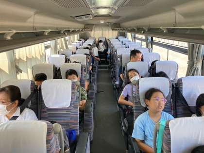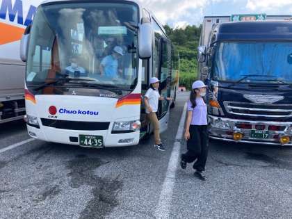 バス車内では、しおりにある歌詞を見ながら歌を歌う子どもや、うとうと寝ている子どもなど、自由にゆったり過ごしています。学校を出発して約1時間後に、最初のトイレ休憩を取りました。