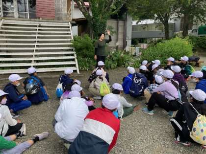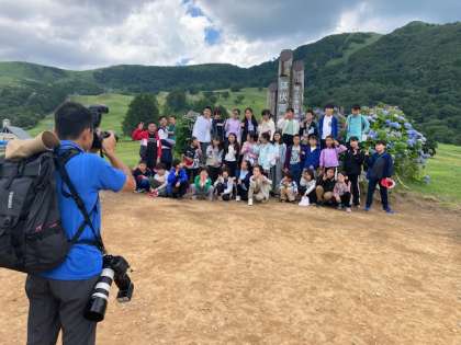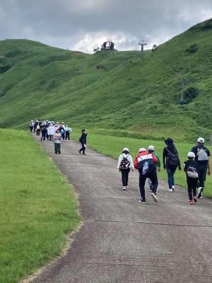 宿舎の方から登山の注意を聞いて、登山開始です。途中、ハチ高原のモニュメント前で記念撮影をして、子どもたちは高丸山頂上を目指しました。