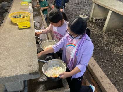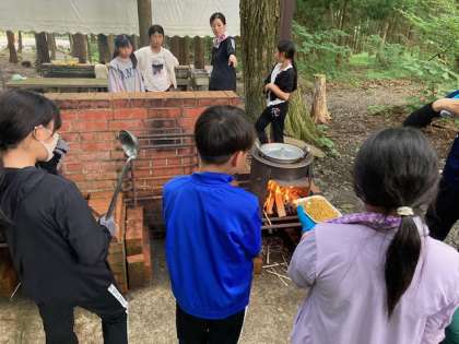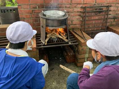 具材を入れた鍋をかまどにかけて、煮ています。なかなか火がつかずに苦労している班もありました。