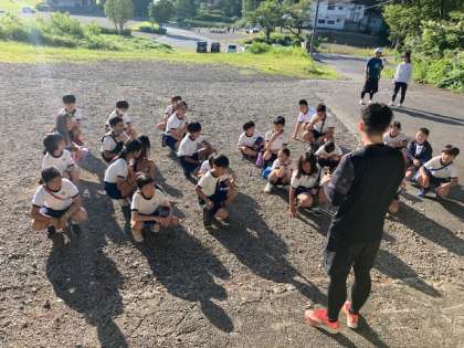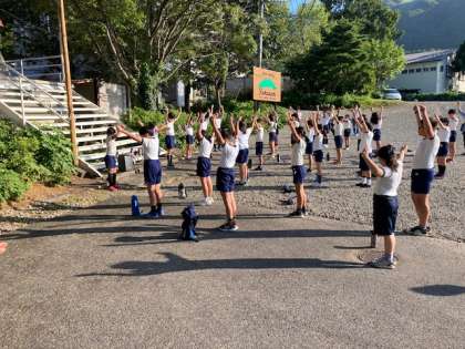 宿舎前の広場に集まって、朝の会をしました。ラジオ体操をして、今日一日の予定の確認をしました。