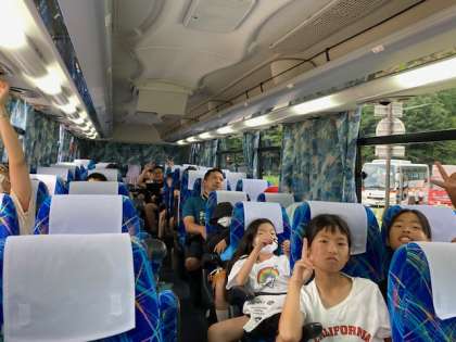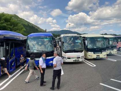 宿舎を定時に出発して1時間ほどのところにあるサービスエリアで休憩です。車内はビデオを観て、静かに過ごしています。サービスエリアは林間学習から帰るバスでいっぱいでした。