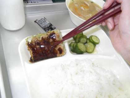 今日の給食のメニューは,ごはん・豚汁・お好み焼き・きゅうりのしょうが漬でした。写真を見ると,「え! これがお好み焼き?」という感じで,イメージとかけ離れていますが、とんかつソースをかけ,味もお好み焼きでした。子ども達は喜んでいただいていました。ごはんとお好み焼きという組合わせが大阪的ですね。