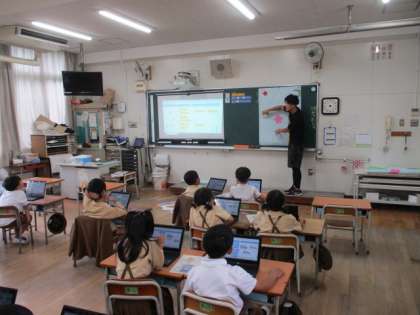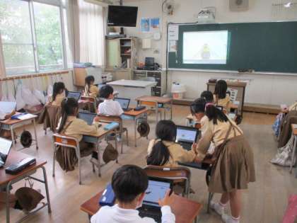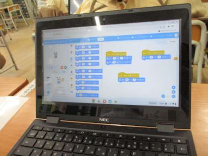 タブレットを活用した学習の様子です。1組は簡単なプログラミング学習を、2組は生活科で調べ学習をしていました。