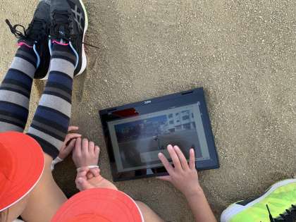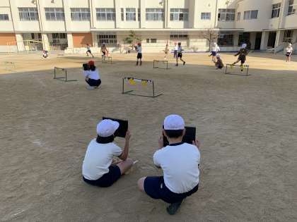 3年生はミニハードルに取り組んでいます。前回はタイムを計り、前回よりもいい記録が出るように取り組んでいます。どうすればタイムが速くなるかを知るため、タブレットを使ってアドバイスを出し合っていました。踏み切る位置、とび方など様々な点に気づくことができました。