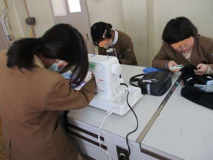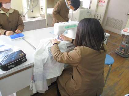 家庭科ではエプロンを作っています。布を折って待ち針で止め、しつけ縫いをし、ミシンで縫う、の繰り返しです。これがなかなか難しいようで、まっすぐ縫えなかったり、違う場所を縫ってしまったり、苦戦していました。