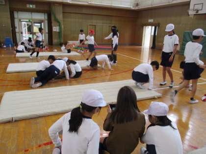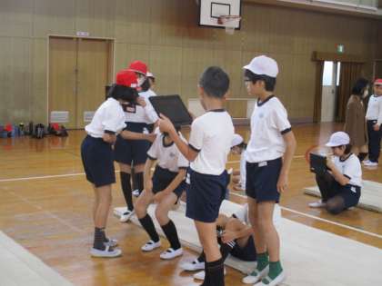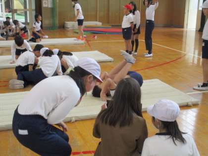 体育でマット運動に取り組んでいます。動画で「できるポイント」を確認してから、各班で協力して上達できるように練習しました。班ごとにお互いの動画も撮って、自分の動きを見ました。