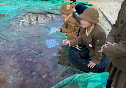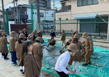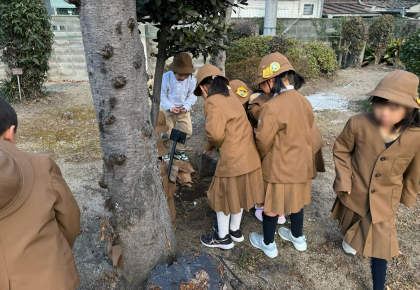 外はとても寒く、水たまりの水が凍っていました。息をはくと白い息が出たり、遊具がとても冷たかったりと色んな冬を見つけることができました。