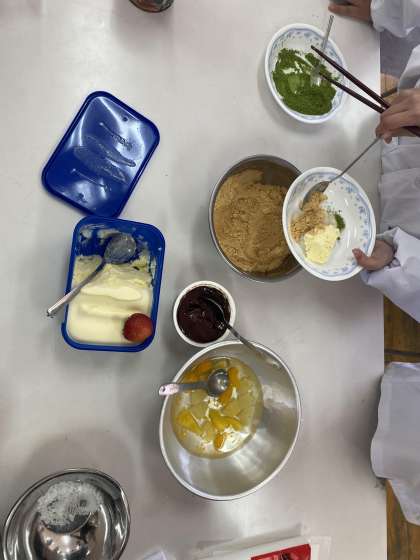 上手に白玉が茹であがってきたらいよいよ盛り付けです。豪華なトッピングの中から選ぶのはなかなか難しい…