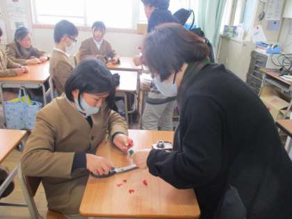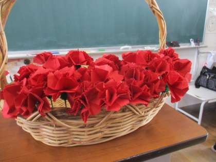 生涯学習ルームの出前授業で、卒業式に卒業生が胸につける「胸花」の作り方を教えていただきました。生涯学習ルームの方たちが手とり足とり優しくご指導していただき、きれいな胸花が完成しました。