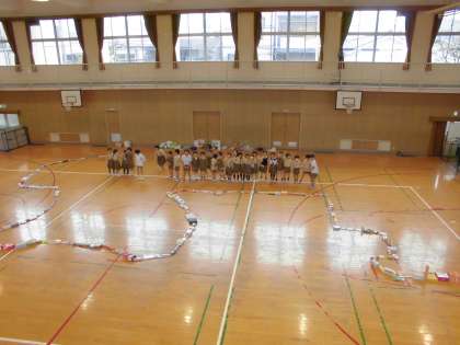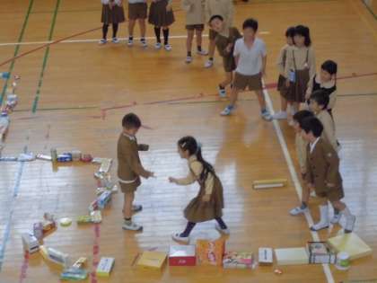班で協力して高く積んだり、全員で全部の箱を長くつないで並べたりしました。その後、並べた箱にそって走り、じゃんけんゲームをしました。