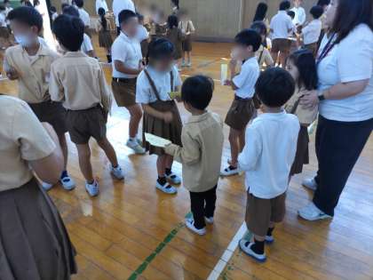 児童集会で「3枚のお札」をしました。じゃんけんをして、勝つと相手のお札がもらえます!活動の中で、たてわり班のお友だちの名前をたくさん覚えられました。