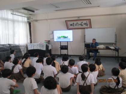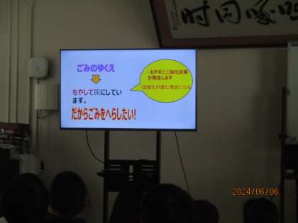 その後、スライドを見ながら、3R(リデュース・リユース・リサイクル)について学習しました。地球の未来のために、ごみを減らすことが大切だということを知ることができました。お家でも、3Rに取り組んでくださいね♪