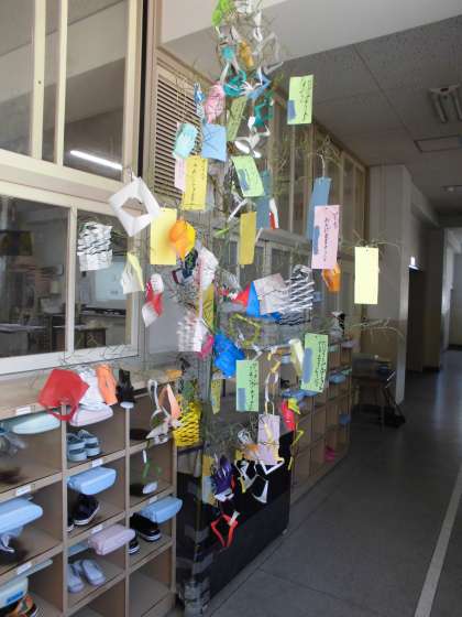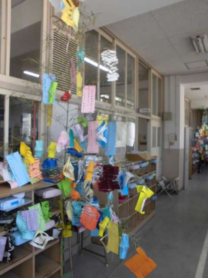 願い事を書いて、ちょうちん、貝、天の川などのかざりを折り紙でつくりました。