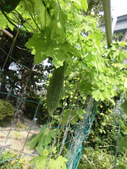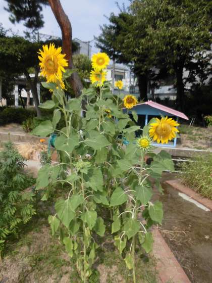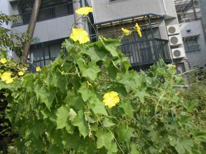 夏らしく、ひまわりや、ヘチマの花が咲いています。ゴーヤもできていました。