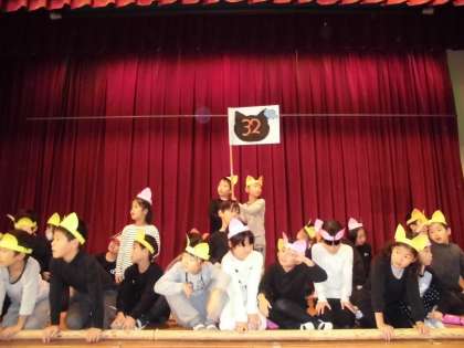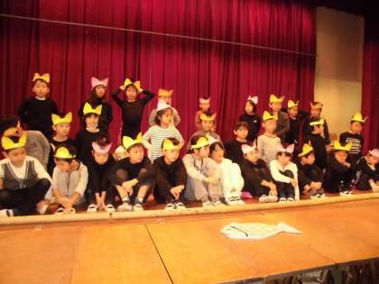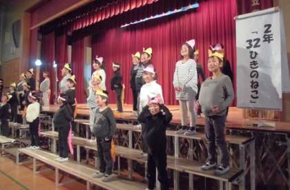 みんなで協力しながら,大きな魚に立ち向かい,何度負けても諦めない!仲間思いのがんばり屋さんのねこたちを2年生32名が堂々とりっぱに演じました。