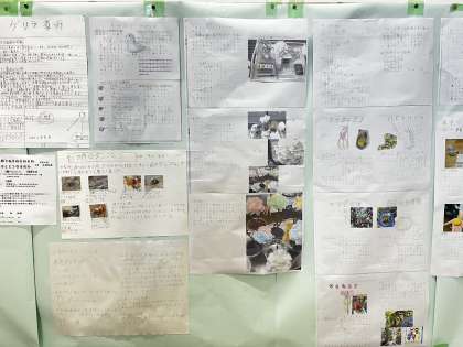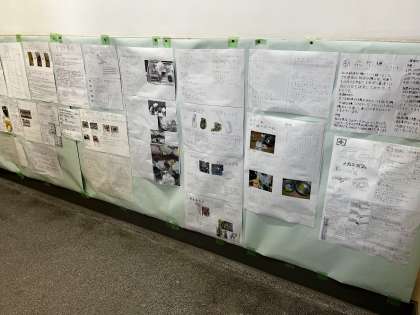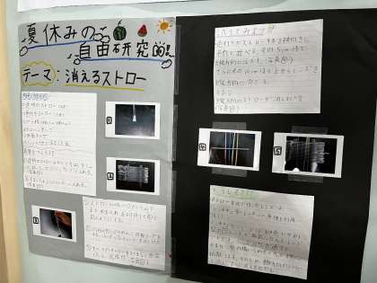『消えるストロー』『地震のメカニズム』『スライム』『10円玉磨き』『食虫植物』『カラスについて』など、様々な夏休みの自由研究が1号階段に掲示されています。