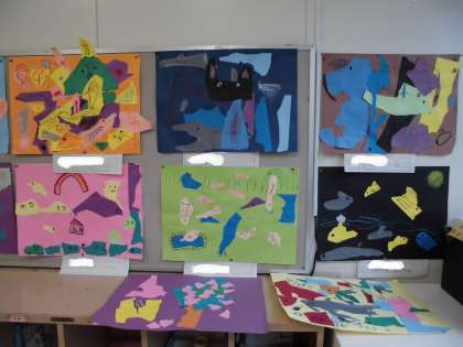 前回の続きです。破いた画用紙が、何に見えるか考えながら貼った後は、クレパスで、目や模様などを書き足しました。